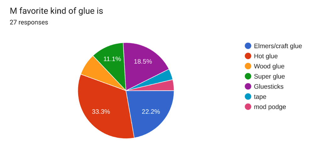 On the glue side of things, a little over 33% preferred hot glue. A close second was elmer’s/craft glue, and gluesticks took up third place with 18.5% of the vote. Several students also wished to inform us that “it’s sticky”.