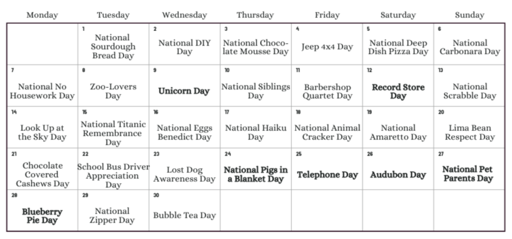 In the wake of the holiday season’s chaos, the spring and summer months may feel monotonous. With the exception of Easter, which not everyone celebrates, March, April, and May can be an unending slough devoid of festivities… but did you know that April 9th is Unicorn Day? Beyond better-known April holidays like Arbor Day —which are often overshadowed by Easter themselves— nearly every day of the month is a slept-on celebration with the potential to be your new favorite day of the year.